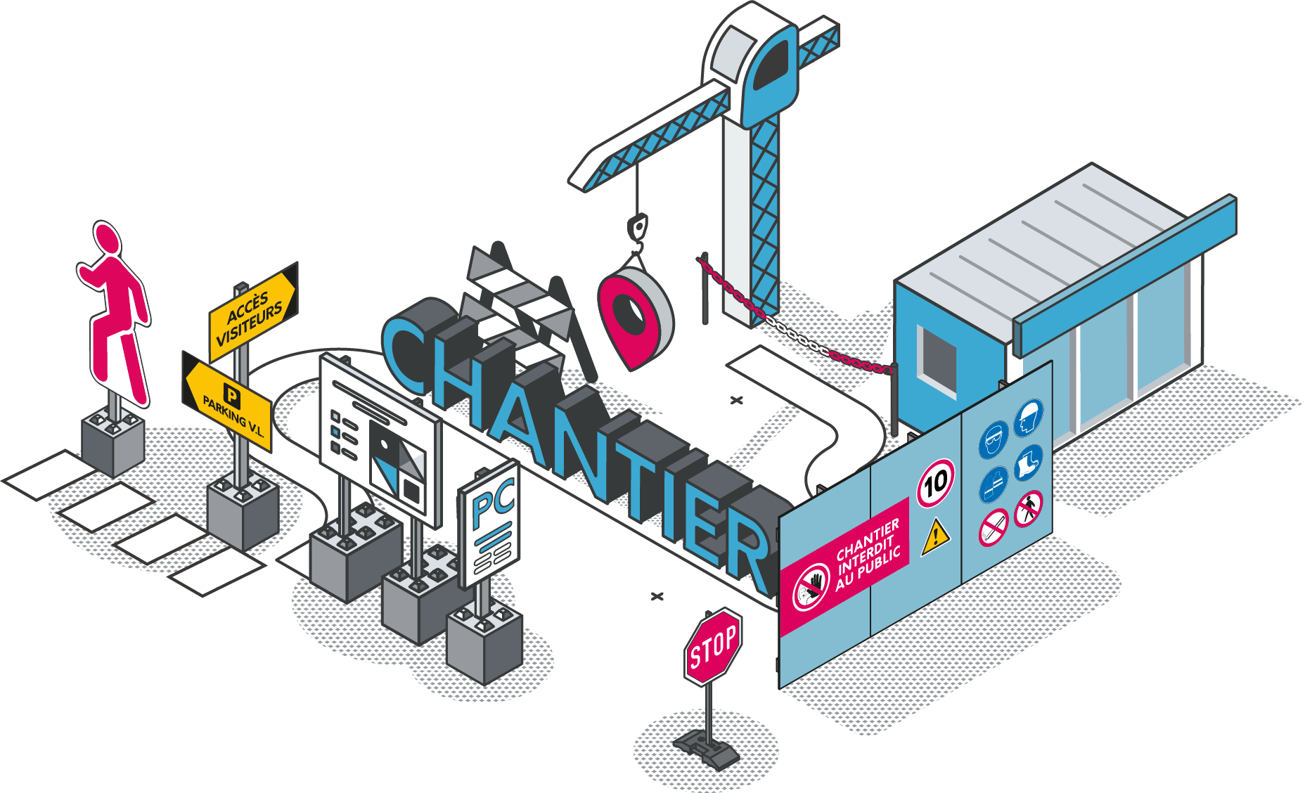 Tous vos supports de communication à l'approche, sur le chantier et sur les bases de vie. Pour sécuriser, informer et orienter les intervenants sur le chantier.