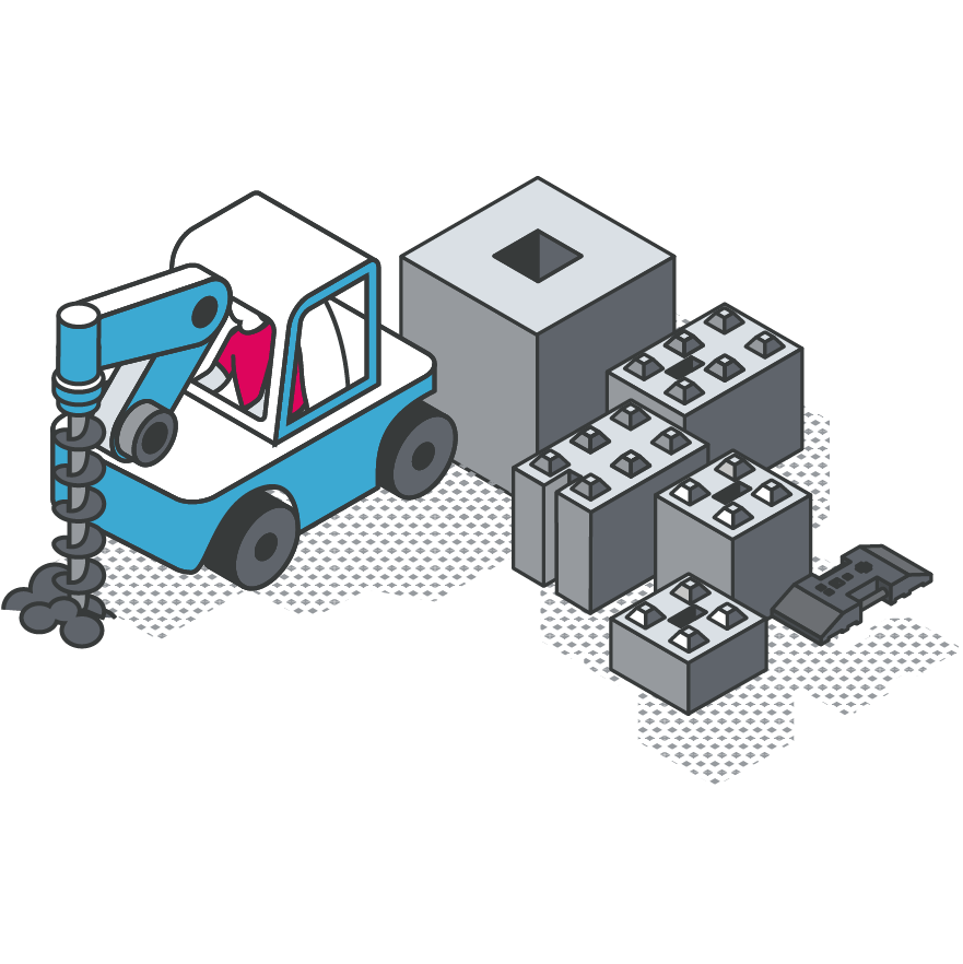 Stabilité, sécurité et savoir-faire. Des solutions de fixation adaptées à chaque chantier avec l'installation de blocs bétons "O'Blocs" ou des scellement avec massifs bétons mesurés.